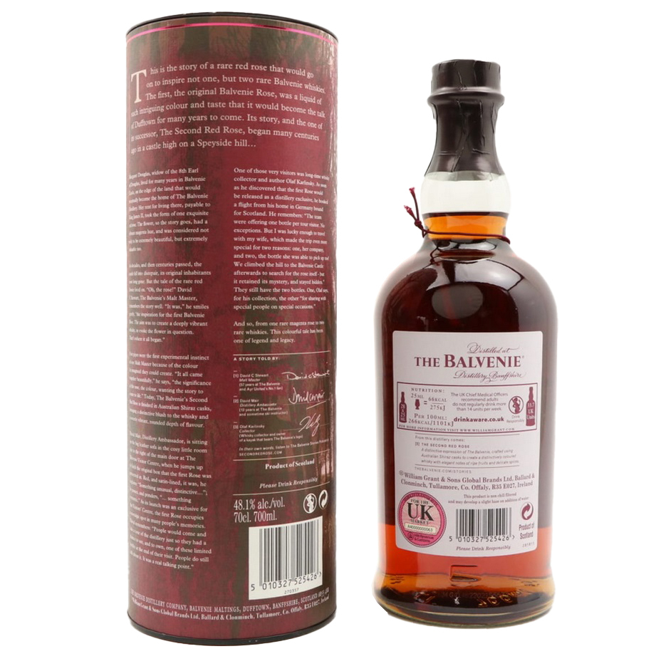 The 21 Year Old The Second Red Rose is the story of David C Stewart and the creation of two extraordinary red roses. Inspired by the history of Balvenie castle, this story celebrates the story of the rose, the desire of our visitors for a distillery exclusive and the romance in creating a new whisky. This is the second red rose and story number 5 in the series. The Second Red Rose is finished in Australian Shiraz casks, for an elegant dram brimming with notes of fresh, ripe fruits and delicate spice.