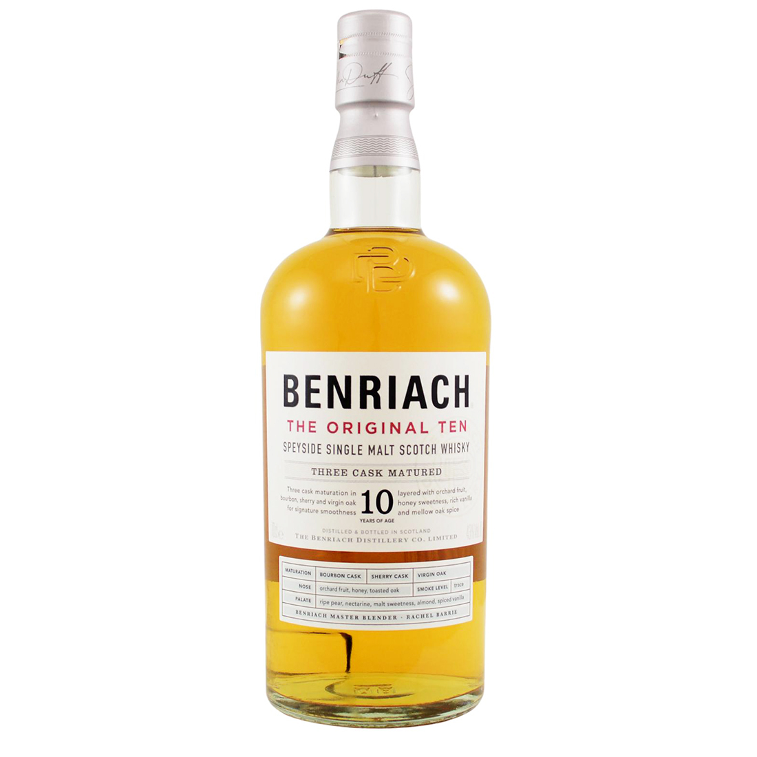The Original Ten from Benriach encapsulates the signature smooth and multi-layered character of the distillery. Three cask matured for at least ten years in bourbon barrels, sherry casks and virgin oak, to create layers of luscious orchard fruit, sumptuous honeyed malt and toasted oak, all interwoven with a subtle trace of smoke.