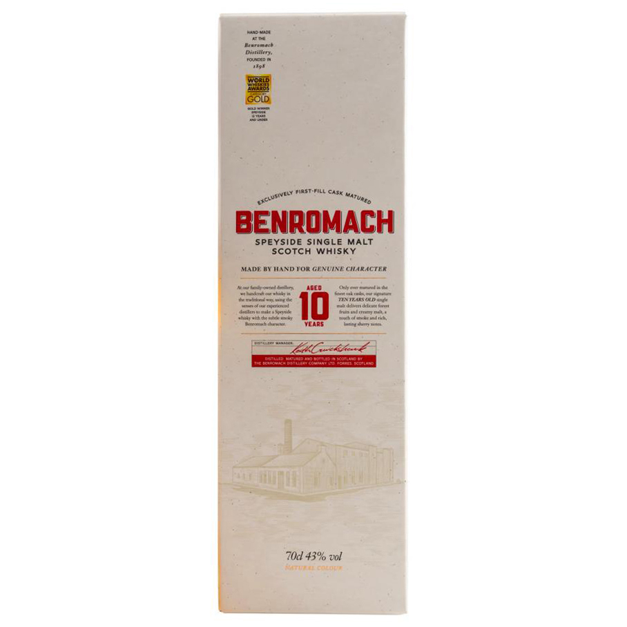 Matured in the finest oak casks, a classic combo of first-fill bourbon and sherry casks, Benromach’s signature 10 Year Old Single Malt delivers delicate forest fruits and creamy malt, a touch of smoke and rich, lasting sherry notes.