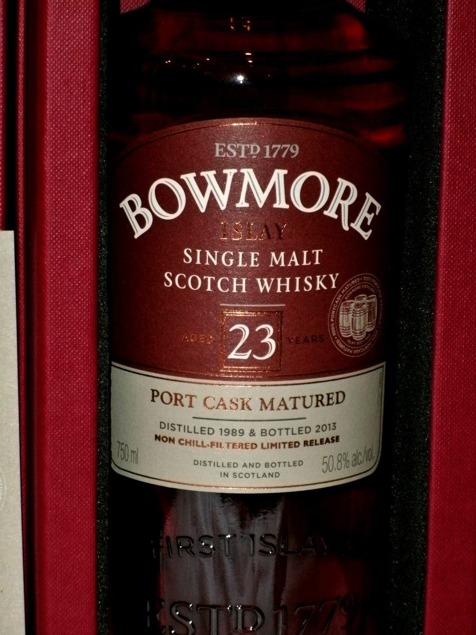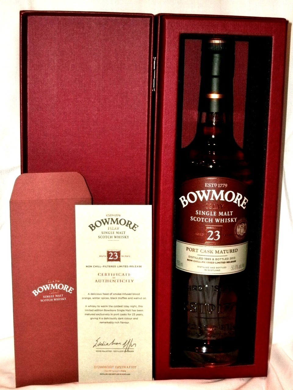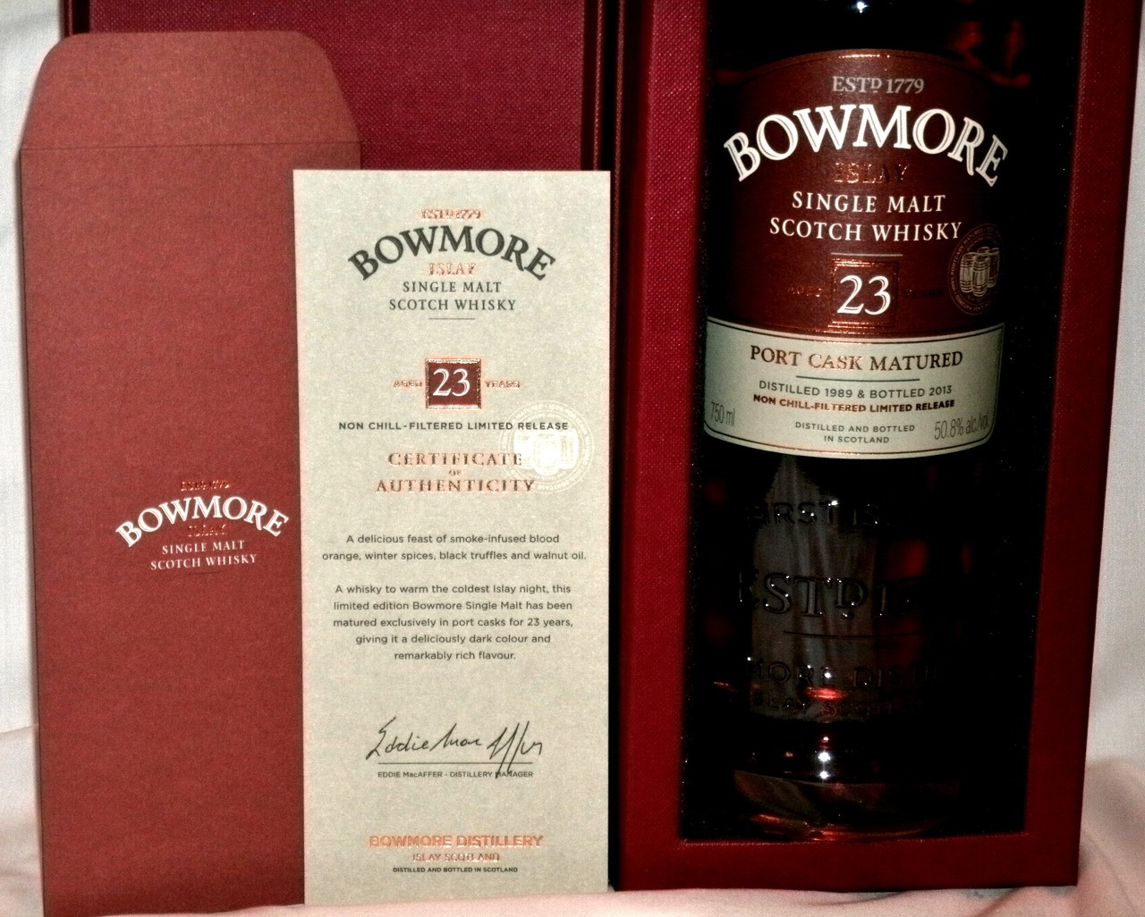 Bowmore 23 Year Old Port Cask Matured 1989 is housed in a 750ml bottle at 50.8%ABV and comes with a Certificate of Authenticity and handsome presentation case.