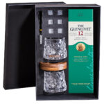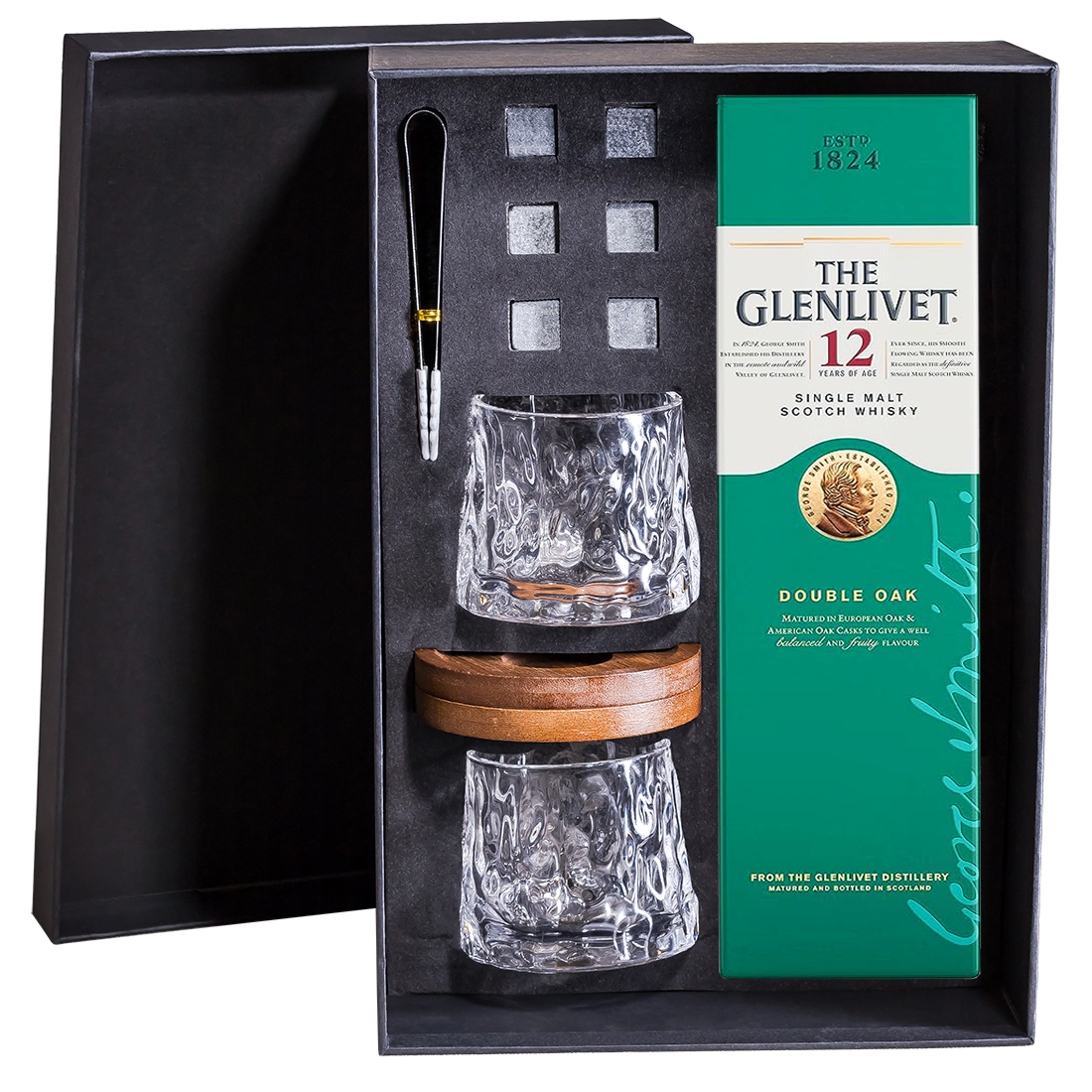 Glenlivet 12 Year Old Single Malt with gift box including 2 spinning tumblers, 2 wooden coasters and 6 stone ice cubes. The shape of the tumblers and coasters will allow them to spin.