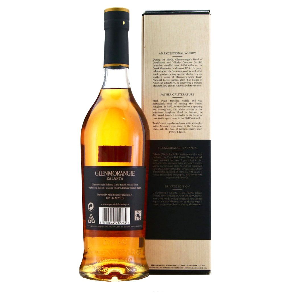Glenmorangie Ealanta is a highly sought-after and award-winning single malt Scotch whisky. This limited edition release is part of Glenmorangie’s Private Edition range, and was named World Whisky of the Year in 2014 by Jim Murray’s Whisky Bible. Ealanta, which means “skilled and ingenious” in Gaelic, is a fitting name for a whisky that was aged in heavily charred virgin American white oak casks, giving it a rich and complex flavor profile.