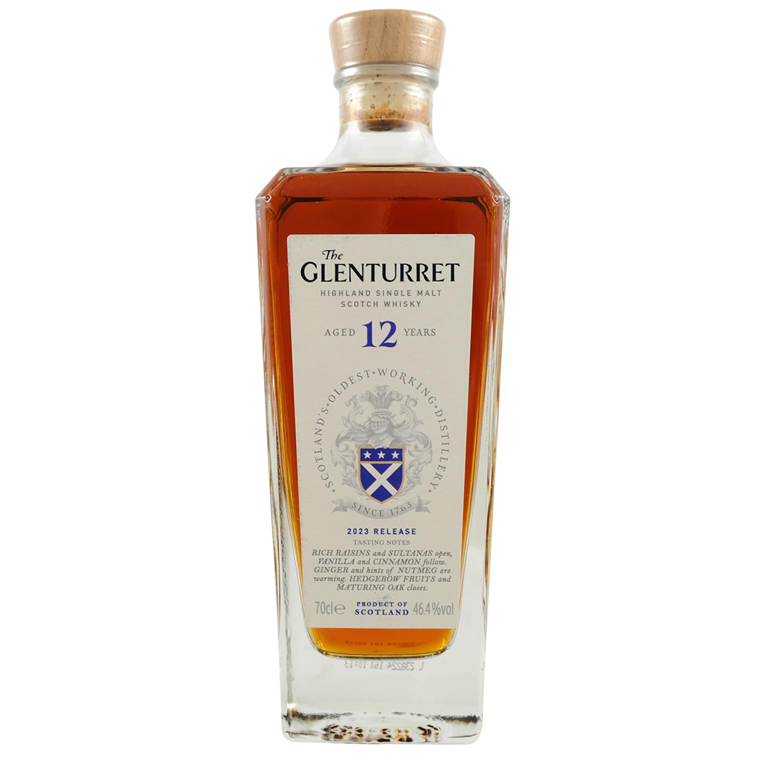 Fewer than sixty carefully selected casks come together to create The Glenturret 12 Years Old – crafted by hand and forming the heart of Glenturret’s range. American oak hogshead casks drive the dessert like sweetness whilst European oak layers the dried fruits and spices leading to a full rich single malt. This is the 2023 release.