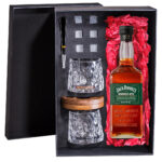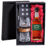 Jack Daniel’s Bonded Rye with gift box including 2 spinning tumblers, 2 wooden coasters and 6 stone ice cubes. The shape of the tumblers and coasters will allow them to spin.