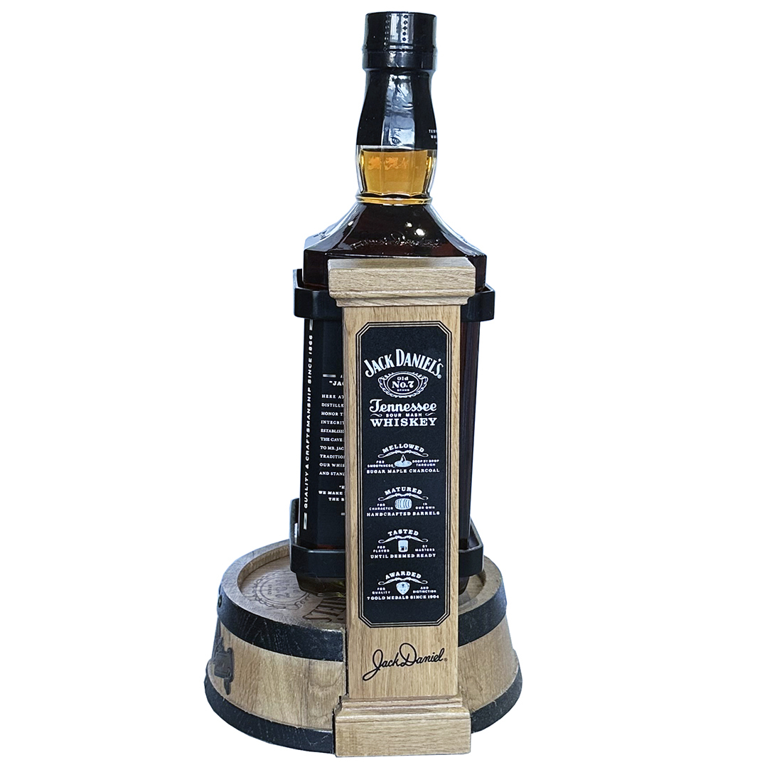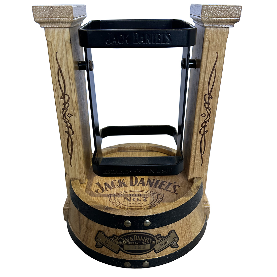A Limited Edition Jack Daniel’s 1.75L bottle Old No.7 with wooden cradle made by Pub Art Australia. This unique cradle is handmade and was only available in Australia. Each cradle was crafted using genuine Jack Daniel’s American oak barrels and the uprights holding the bottle are the original barrel staves. The plaque on the front of each cradle is individually numbered.