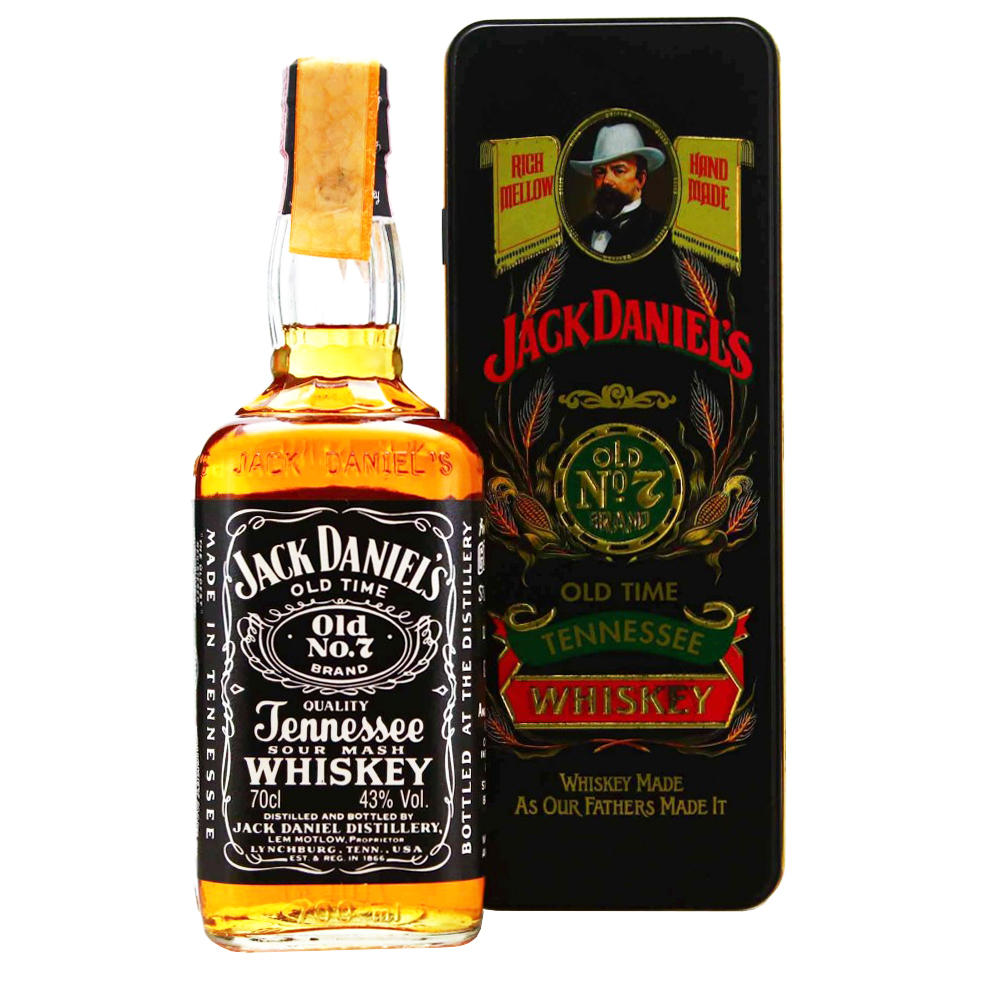 An older European bottling of Jack Daniel’s Old No. 7 with metal tin.