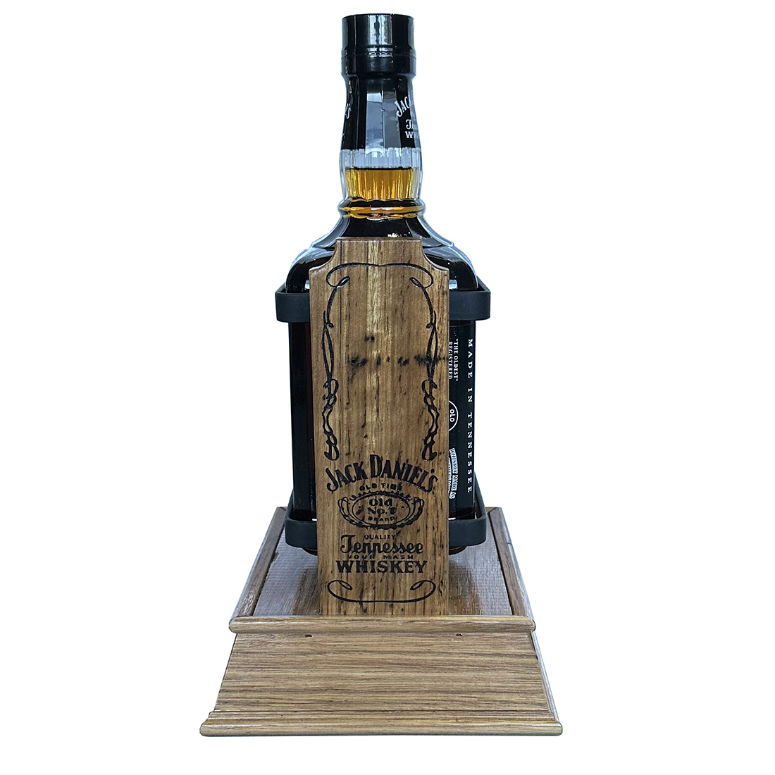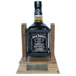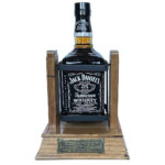 A Limited Edition Jack Daniel’s Old Time 1.75L bottle Old No.7 with wooden cradle made by Pub Art Australia. This unique cradle is handmade and was only available in Australia. Each cradle was crafted using genuine Jack Daniel’s American oak barrels and the uprights holding the bottle are the original barrel staves. The plaque on the front of each cradle is individually numbered.