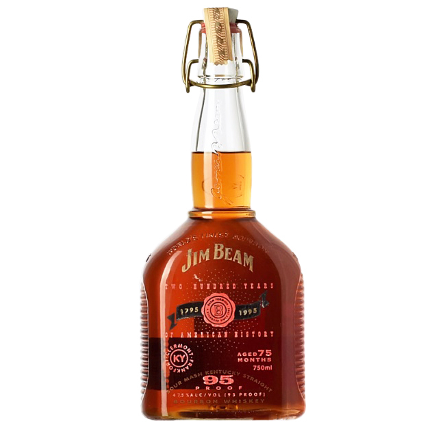 Jim Beam 200 Year Anniversary 1795-1995 Limited Edition Whiskey. This commemorative bottle of Jim Beam Sour Mash Kentucky Straight Bourbon Whiskey celebrates two hundred years of American history. This special bottle was released in 1995 marking the 200th anniversary of Jim Beam Kentucky Bourbon Whiskey. The whiskey was aged for 75 months and bottled at 95 Proof.