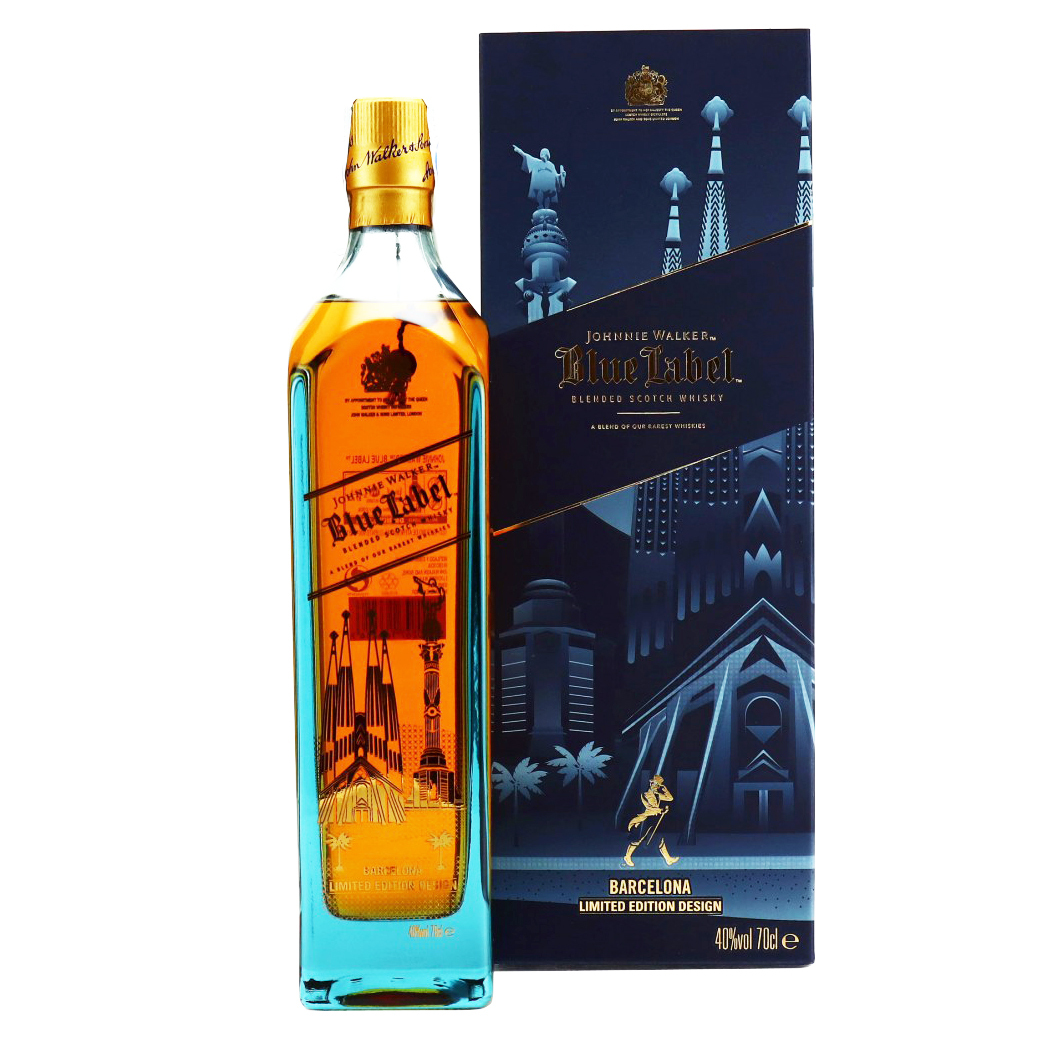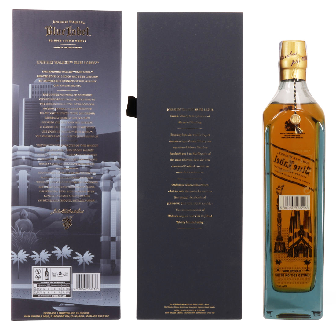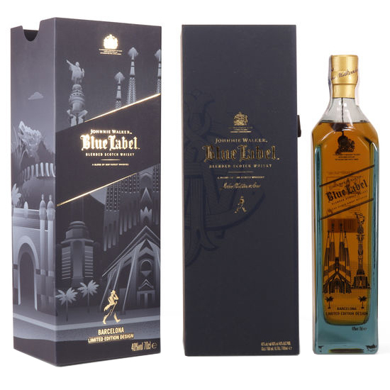A Limited Edition bottling of Johnnie Walker Blue Label with a cityscape of Barcelona on the bottle and box. The design captures the essence of the vibrant city of Barcelona.