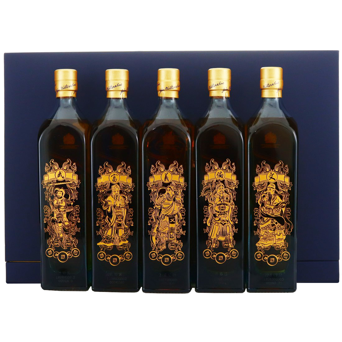 Johnnie Walker Blue Label Special Collection Five Gods of Wealth created using 18K gold engraving techniques and Chinese-style patterns. The ‘Five Gods of Wealth’ in Chinese culture represent wisdom, vision, integrity, fortune, and luck. Each bottle in this collection depicts a different god and comes displayed in a sophisticated presentation stand.