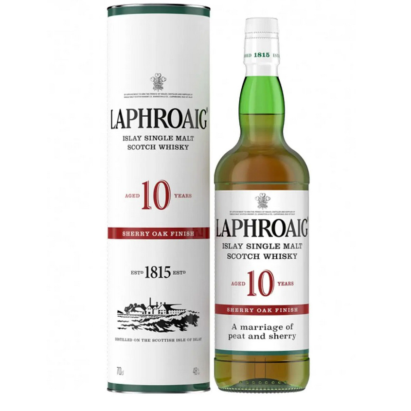 Laphroaig 10 Year Old Sherry Finish Islay Peated Single Malt. Unforgettable flavours from Laphroaig’s classic 10 Year Old whisky find harmony with the sweetness and complexity of Oloroso sherry. After being matured for in ex-bourbon barrels drawing rich character, the spirit then rests in casks previously filled with sweet Oloroso sherry.