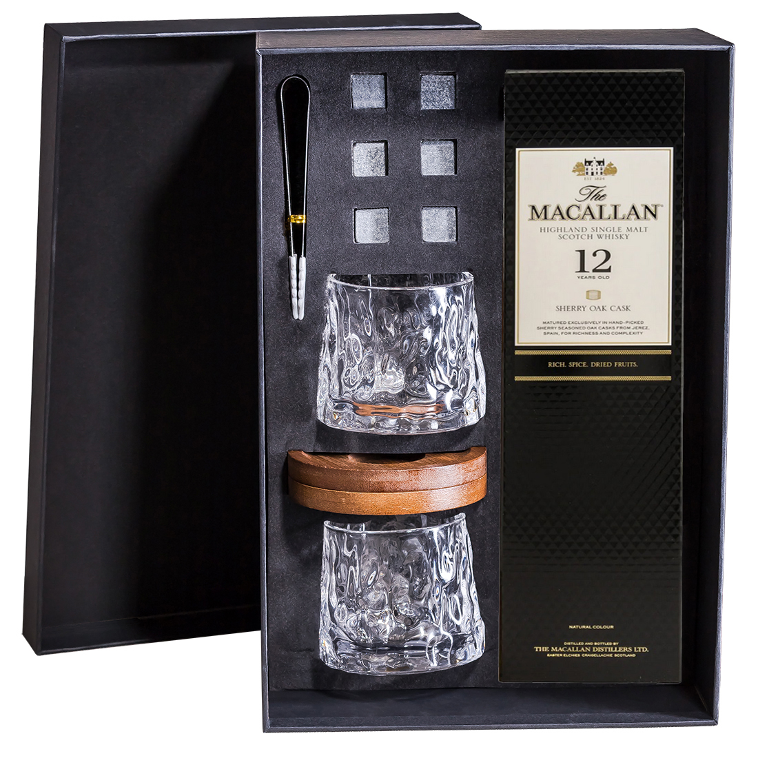 Macallan 12 Year Old Sherry Oak Single Malt with gift box including 2 spinning tumblers, 2 wooden coasters and 6 stone ice cubes. The shape of the tumblers and coasters will allow them to spin.
