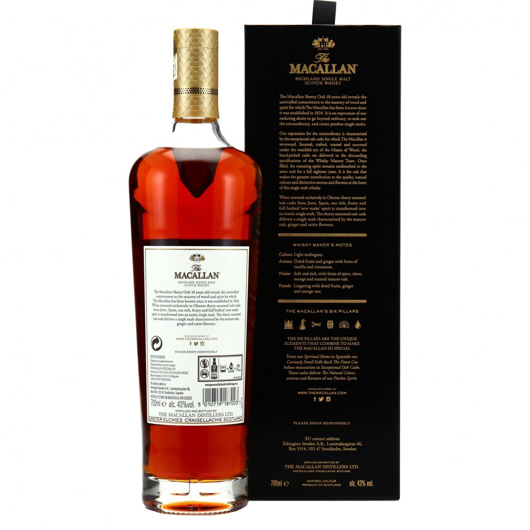 This version of the 18 year old was the first to debut a new packaging style since 2006, with the long-running shiny purple box retired the previous year. This now joined the classic 12 year old expression as part of the Sherry Oak Cask strain of the Macallan core range.