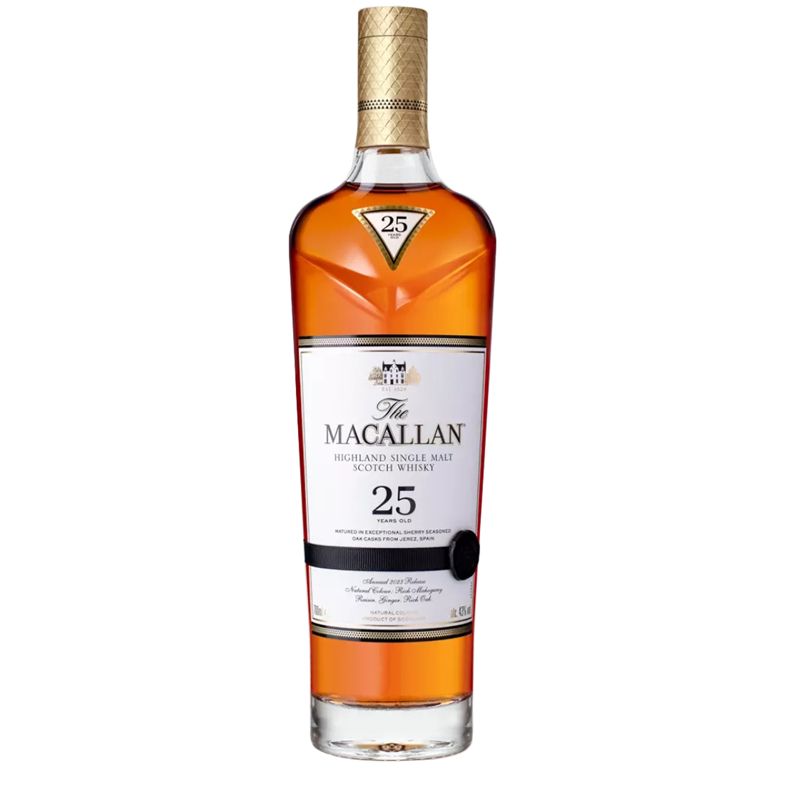 This is the 2023 Release of Macallan 25 Year Old, matured for a quarter of a century in European Oak, sherry seasoned in Jerez de la Frontera, Spain. During this time the maturing spirit transformed to create this luxurious Single Malt Whisky bringing to life the flavours of raisin, dried orange, black cherries and rich oak.Â