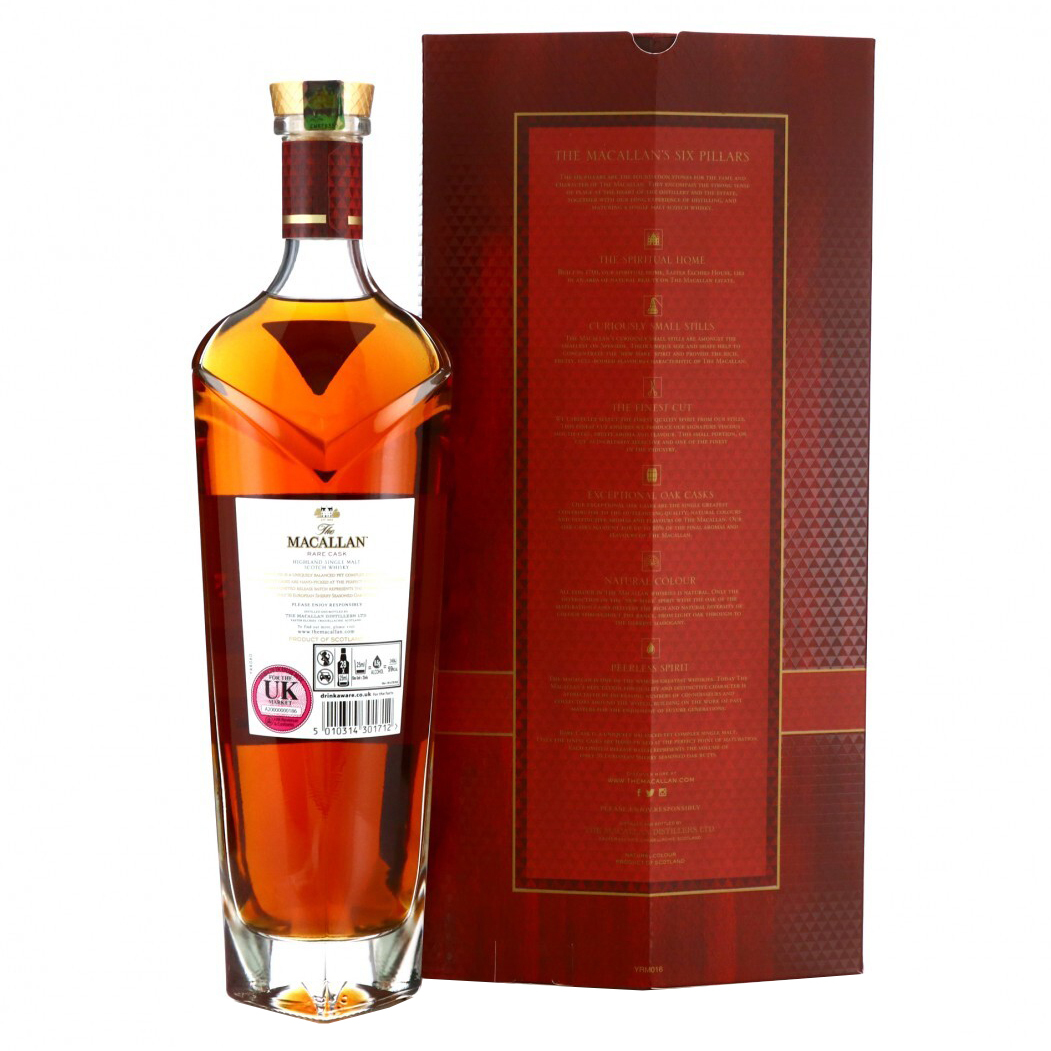 The Macallan Rare Cask takes its name from the extremely rare Spanish sherry seasoned oak casks which are hand selected by the Master Distiller at the Macallan Distillery. This specially selected oak helps mature the single malt whisky into a complex dram, with changing layers of fruit, sweet chocolate and soft vanilla.