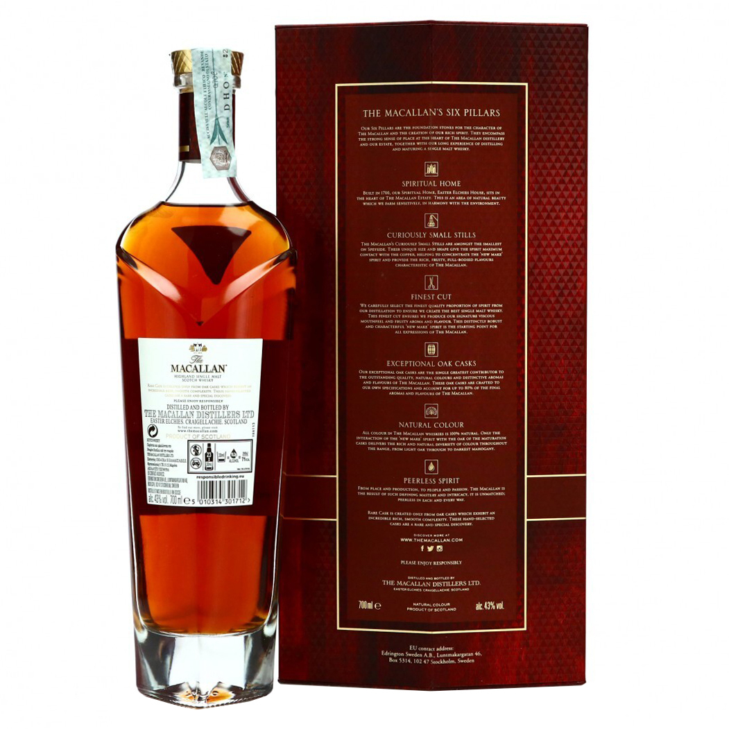 The Macallan Rare Cask takes its name from the extremely rare Spanish sherry seasoned oak casks which are hand selected by the Master Distiller at the Macallan Distillery. This specially selected oak helps mature the single malt whisky into a complex dram, with changing layers of fruit, sweet chocolate and soft vanilla.