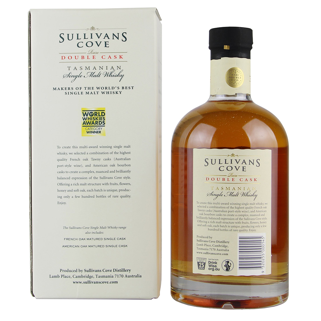 This Double Cask of exceptional Tasmanian Single Malt from Sullivans Cove was matured in a combination of French oak ex-tawny cask and American oak ex-bourbon cask. One of 1430 bottles released. It was distilled in April 2008 and bottled in January 2019.