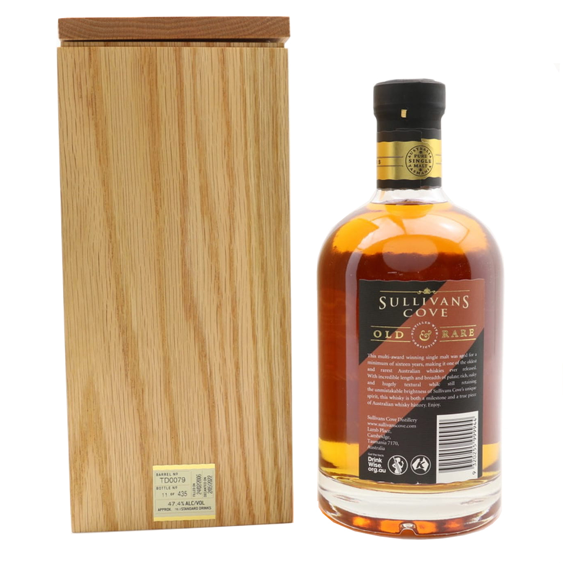 Part of the ‘Old and Rare’ Collection, this Single Cask is an exceptional Tasmanian Single Malt from Sullivans Cove. It was matured for a minimum of 16 years in a unique American oak. One of 435 bottles released. It was distilled in February 2006 and bottled in May 2022.
