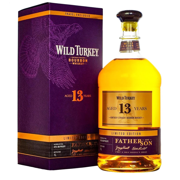 A Limited Edition Release Wild Turkey Father & Son 13 Year Old Kentucky Straight Bourbon Whiskey. It was created by Jimmy and Eddie Russell, the only active father & son master distiller duo in the world. Jimmy Russell started working at Wild Turkey in 1954, and Eddie followed him in 1981. Together they have over a hundred years of experience making high quality bourbon.
