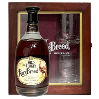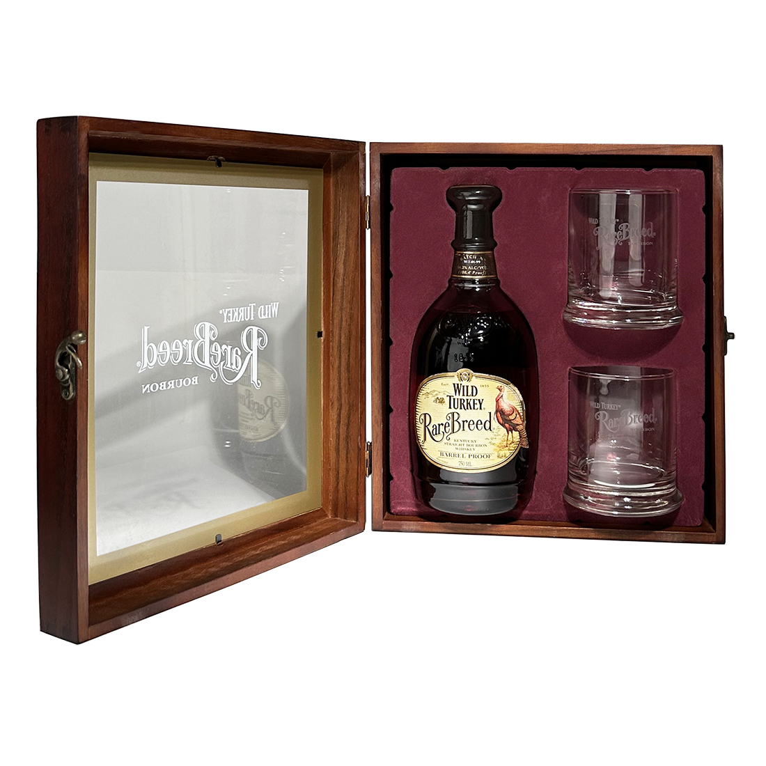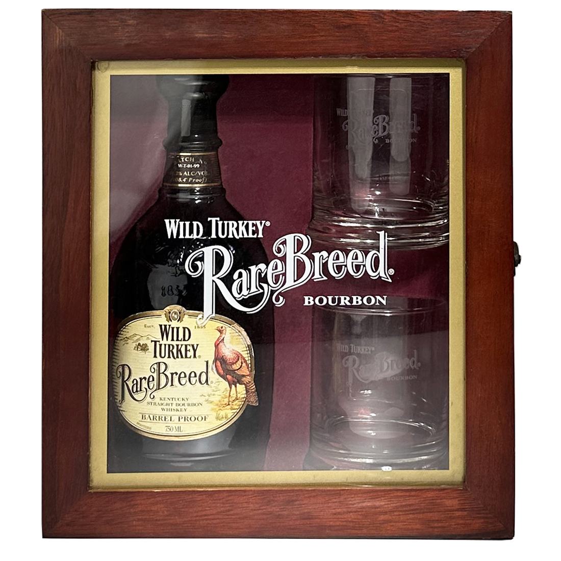 This is Batch W-T-01-99, bottled at a barrel proof of 108.4 and released in 1999. Comes in a wooden gift box with 2 whisky/bourbon glasses. The glasses are engraved with ‘Wild Turkey Rare Breed Bourbon’.