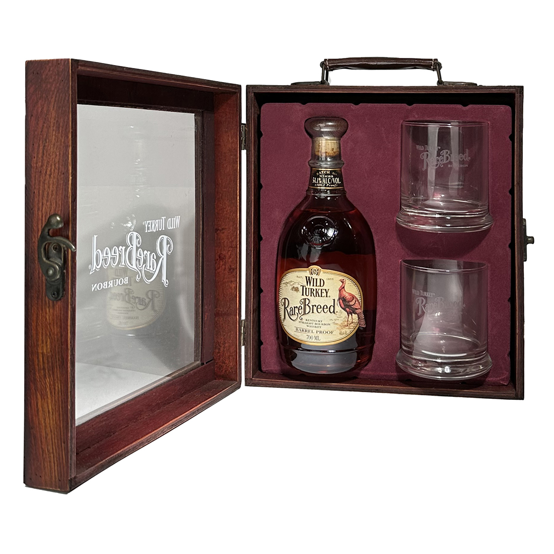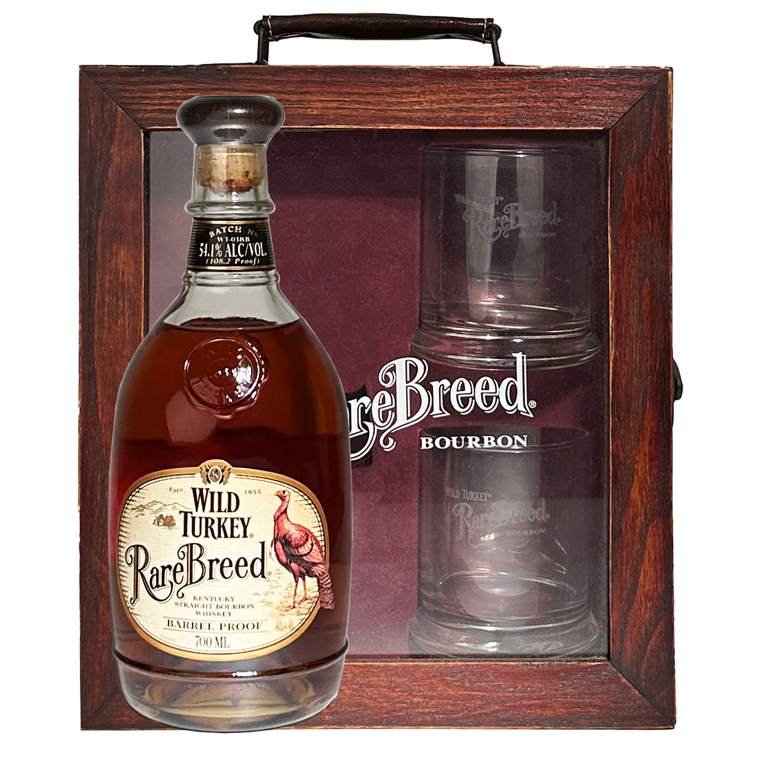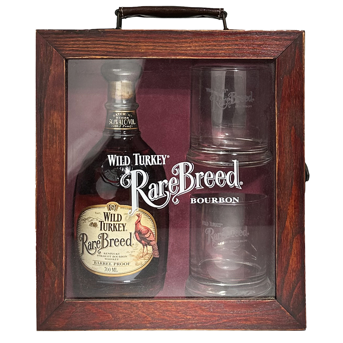 This is Batch WT-03RB, bottled at a barrel proof of 108.4 and released in 2003. Comes in a wooden gift box with 2 whisky/bourbon glasses. The glasses are engraved with ‘Wild Turkey Rare Breed Bourbon’.